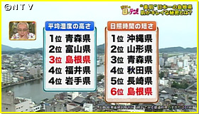 専門家曰く、「島根県は他の地域に比べて、肌に良い環境条件が揃っている。雨が多いので湿度が高く、日照時間が短いので紫外線の影響を受けにくい。その2つの条件が揃っている県」。島根県の年間の気象条件をみると・・・平均湿度が全国で3番目に高く、日照時間の短さは6番目。確かに紫外線の影響を受けにくい環境にあります。でも、青森県は、「平均湿度」「日照時間の短さ」でいずれも島根県より上位にいます。実は、寒い地域は血行が悪くなりやすく、また皮脂の量が少なくなって肌から水分が逃げやすくなるため、肌に良い環境とは言えないんだそうです。