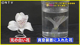 まず、こちらの白い花。でも、これ本当は白じゃないんです。一体、本当の色は何色なのか?真空の力を使うと、この花の本当の色が見えてくるんです。真空装置に水に浸けた花を入れると、ボコボコ泡が出てきます。実は花ビラの中には、結構な量の空気が入っているんです。その花の中の空気が抜けて、出てきているんです。こうしておよそ10分間後、真空装置の空気を元に戻してみると・・・白い花が透明に!
