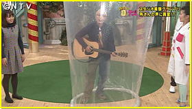 そして、もうひとつ実験!今度は所さんに体験して頂きます。所さんがビニールの空間に入ってみると、声が高音に変わりました。