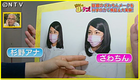 では実際にどこまでそっくりになれるのか!?メイクをすること60分…最後にカツラとざわちんのトレードマーク、マスクを着けて完成です!ご対面した杉野アナ本人もビックリするほど似てたので、ある事をしてみました。まず、メイクしたざわちんを撮影し、杉野アナもマスクを着けて撮影。