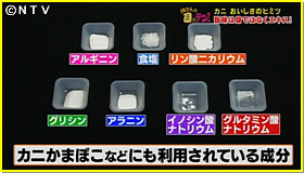 しかも、カニ味はすでに分析されていて、これらの成分を混ぜ合わせれば、カニ味を再現できるというんです。さらに先生によると、「カニに含まれているエキス成分を配合して添加すれば、カニ以外のものでもカニ味になる」んだとか!