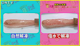 冷凍カニとは思えないほどエキスたっぷりの茹でカニを家庭でおいしく食べる事ができるんです。続いて、生のまま冷凍されたカニの場合は・・・解凍の仕方にもポイントが。生の冷凍カニを解凍するときは、塩水に浸けて解凍した方が良いそう。カニは普段、海に生息しているので塩水で解凍することによって、細胞から水やうま味が出て行ったりということが起こりにくくなると言われています。生の冷凍カニを解凍するときは塩分を1%ほど(水1リットルに対し、塩小さじ2杯分)の塩水に冷凍カニを浸し・・・。ラップをして冷蔵庫で解凍します。自然解凍したものと、塩水で解凍したものを比べてみると・・・そのまま解凍したカニは色がくすんで張りもないのに対し、塩水で解凍したカニは色も鮮やかでみずみずしい。