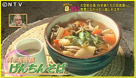 山あいの傾斜地で、昼と夜の温度差が大きいという気候が、豊かな風味と強い甘みがあるそばを育てると言われています。収穫したての今がまさに食べごろの常陸秋そば。「けんちんそば」がオススメの美味しい食べ方ということで、地元食材を扱う直売所で名物常陸秋そばと里芋、人参、ネギなど地元の野菜を買い調理します。地元の野菜を煮て、麺つゆだけでシンプルに味付けなのに味は格別!来年はこの土地で穫れたもので、目がテンオリジナルそばが食べられるかもしれません。