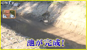 箱の上部に開いたこの穴から水が入り、中に溜まっていく仕掛けです!土や泥が中に入らないよう、フタをすれば完成!そして、箱の脇に取り付けたホースで水を取り出し、山の傾斜を利用して、池へと導きます。すると・・・見事、透き通った水が出ています!このホースの先端を池へ持っていけば…見事に池に水が溜まっていきました!畑に豊かな水をもたらす池がついに完成しました!前回、ジャガイモを植え、今回は池も出来、なんだか順風満帆な田舎暮らし。しかし!今、田舎暮らしの土地の周辺で、ある動物によるとんでもない被害が相次いでいたのです。