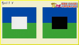 これは姫路城の様子を簡略化して色の部分だけを取り出したもの。青い部分が空。緑の部分が木々とか山。白い部分がお城です。中央の四角の大きさを比べると、なんとなく白の方が大きく見えますよね?だけど実際は全く同じ大きさ。つまり、目の錯覚なんです。人間の目は白を大きく見える様にできている。この錯覚効果を利用して姫路城をより大きく威厳があるように見せたのではないか?というのが竹内先生の仮説です。