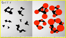 この何の形だかわからない黒い模様に赤い丸を重ねると文字が浮かび上がるんです。赤い丸の下に何かが隠れているんじゃないか?と思うと頭が勝手に補完してABCDを作ってしまうんだとか。