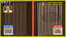 お店の中におじゃまさせてもらうと…部屋の中からは、歩いている人の服の色まではっきり見えます。これは、人間の目が明るいところに慣れやすい性質があるためなんです。金沢の木虫籠は、京都などの町家に見られる一般的な格子に比べて、細く、狭い作りになっています。木虫籠をよ〜く見ると、格子の一本一本の内側が、狭い台形になっています。台形にすることでどんな効果があるのでしょうか?伝統建築に詳しい金沢工業大学、環境・建築学部の山崎幹泰准教授に聞いてみると…「金沢の木虫籠は、京都の紅殻格子などに比べても、非常に細く隙間も狭い作りになっています。断面を台形にすることで、外からと内からの見えにくさ見えやすさを調整していると考えられる」と解説。そこで実験!長方形と台形の格子で見え方にどんな違いがあるのか比較します。幅と間隔を全く同じに揃えた、長方形と台形の格子を作って実験開始。わかりやすいように番組ロゴが格子越しにどう見えるか観察します。四角いハコを家と想定し、光があたっている方が外、暗い方を内側として、間に格子を挟んで見比べます。部屋の内側から、外に貼った番組ロゴを見ると…左側の長方形に比べると、右側の台形の方が少し明るく、外が見やすくなっています。台形の格子は斜めに削った側面が明るくなっています。建築構造に詳しい工学院大学、建築学部・建築デザイン学科の西森陸雄教授によると、これが木虫籠が台形になっている理由だといいます。西森先生は、「木虫籠の特徴的な台形の断面というのは、室内の暗さと外の明るさの間をちょうどうまく調和する機能を持っていると思います。長方形の状態だと、中から見た時に格子の内側が非常に暗い状態になって外の明るさとの間にすごいギャップがあります。そうすると人間の目っていうのは、暗いところにいると外の景色が白く飛んで見えて外の景色をハッキリ見ることができない。