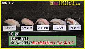 「白身おまかせにぎり」5貫!似たような見た目の白身魚の名前。金沢市民はこれを食べただけで、当てられるか実験します!小学5年生の男の子から、実験スタート!まずは実食。名前がわかったら札を置いてもらいます。・・・が!一貫食べたところで他のネタに札を置き、しかも正解!なんと見た目で判断!その他は、全て食べ終わってから考え、札を並べていきました。さて、結果は…5ネタ中3ネタ正解!それでもお見事!そして、地元の大人たちは…まずは見た目で判断し、食べながら札を置いて、全問正解!中には、なんと見た目だけで判断し、全問正解する人も!