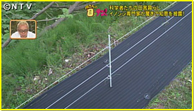 地面に、電流が流れない絶縁体があると、イノシシは感電しなくなってしまいます。そこで先生は…電気の流れる防草シートを作成。太陽光を遮断する生地で、雑草が伸びるのを防ぎ、生地には銅の針金が編みこまれているため、電圧も下がらないという優れもの。