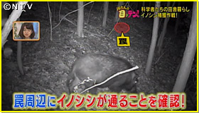 そしてイノシシ肉を頂きつつ、山本先生は猟友会の皆さんとコミュニケーション。これからのイノシシ調査に猟友会の皆さんも協力してくれる事になりました。翌日。さっそく山本先生達は、仲良くなった猟友会の方と田舎暮らしの土地の裏山へ。そこで先生はイノシシの匂いが残るこの場所に罠を仕掛け、イノシシを生け捕りにすることに。でも、生け捕りにして何をするつもりなのでしょう?山本先生は、「電波発信機をつけていく」と説明。罠にかかったイノシシに麻酔をかけ、耳に電波を出す装置を取り付けます。その電波を受信器で拾い、イノシシの行動範囲などを調査するのです。その目的を先生に聞くと、「出てくるところをしっかり見晴らし良く狩り払えばイノシシが出てきにくくなりますし、イノシシはやっぱり増えますので、捕獲するときに、イノシシがよくどういう場所を使っているかわかれば、より効率的に捕獲体制が組めるとか。色々なメリットがある」と説明。罠は2か所。猟友会の方と先生が話し合い、出没しそうなポイントに設置。罠のそばの木に匂いの強いコールタールを塗りました。
