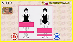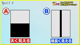 例えば、面積が同じ二つの長方形を、それぞれ二色で分割すると、横に分割されたAが太く、縦に分割されたBは細長く見えます。これがバイカラー錯視の効果。このバイカラー錯視という点からみるとこの女性は、錯覚的に太って見えてしまうファッション。