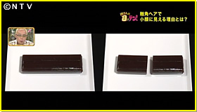 例えば、羊羹を真ん中から半分に切り、まるまる1本の場合と比較してみます。確かに半分に切った方が短く見えませんか?触角ヘアは、頬を分割、狭く見せるので、小顔に見せる効果があるんです。そしていよいよ、後藤アナの触角ヘアが完成!