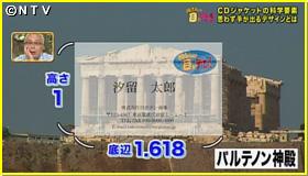 兼高教授によると、「ジャケットはCDの顔ですから、店頭に並んでいるジャケットが"なんかいいじゃないか"、"目立つ"、"つい気になる"、そういうものになるように考えるのがいいと思います。黄金比を活用するのがいいのでは」とのこと提案。黄金比とは、長さの比が「1対1.618」になる比率のこと。 "人間が、最も安定し美しいと感じる比率"といわれています。身近なところでは名刺にも使われていて、縦型でも横型でも同じ比率なんです。ギリシャのパルテノン神殿は、高さと底辺の比が黄金比になっていて、画像に名刺を重ねてみると、ぴったり収まります。