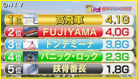 今回番組で調べた5つの絶叫マシン・Gランキング。上位2つは待ち時間が長い人気のジェットコースター系だったのだ!