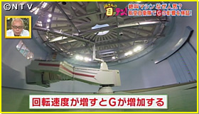 まずは、Gに耐える為の体の使い方をレクチャーしていただいてから実験へ。巨大アームを回し遠心力を発生させるマシーンに乗り込みます。絶叫マシンと同等のGを受けた時に、スリルを感じるのか?