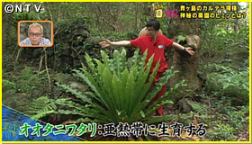 実はコレ、オオタニワタリという亜熱帯の植物。シダの仲間で、葉の裏につく胞子を飛ばして、樹上や岩の上に着生します。葉の中心に溜まる落ち葉などを腐葉土にし、養分を吸収するため土がなくても生育できるんです。オオタニワタリは日本では絶滅危惧種のため、これだけ群生するのは極めて珍しいと言われています。気づくとそこは、背の高いまっすぐな木ばかり。一方、カルデラの外は背が低い樹が多く目立ちます。では、一体なぜカルデラの外と中で植生が違うのでしょうか?