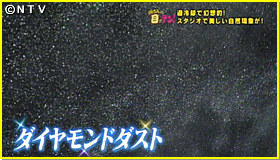 続いて、「過冷却」を利用して、幻想的な実験にも挑戦!用意されたのは、大きな冷凍庫と、梱包用の緩衝材。今、冷凍庫の中はマイナス30度くらいです。そして、スタジオの照明を落とし、冷凍庫の中に息を吹きかけると…寒い冬の息と同じように白くなります。ここに、梱包用の緩衝材を潰すと…ダイヤモンドダストが出来たんです!