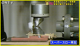 そのシステムがこちら!透明の塩ビの筒が固定されていて先端には、アルミテープで蓋がしてあります。 その反対側にピンポン球を入れて蓋をし、真空ポンプで筒の中の空気を抜きます。筒の中は真空なので、蓋を開けた方から空気が入ってきて、空気の力でピンポン球が反対側に押し出されます。では、一体どのくらいの勢いで出てくるのか、出口にアルミの空き缶を置き、蓋を開けると・・・なんと目には見えない速さでピンポン球が空き缶を突き破りました!そのスピードを、スーパースローで見てみると…ピンポン球がぶつかる前に、缶が凹んでいます。これは、ピンポン玉に押された空気が缶を押しているからなんです。そしてピンポン玉が時速約900キロ、ジェット機並みのスピードで飛んできます。このパワーが缶を貫いたんです。