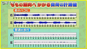 続いては能の基本動作「ハコビ」です。すり足のような独特な動きにはある秘密が!実は、能舞台の床の木目は、すべて同じ方向を向いているんです。すり足のような動きには自分が舞台のどこに向かっているかを足の裏で感知する役割があったんです。足の指で床を掴むように、力を込めて歩きます。この時、筋肉にどのような負荷がかっているのか?モモの筋肉を筋電計で計測、通常の歩行と比べてみると、ハコビの動きも下半身の筋力トレーニングになっていることがわかりました。須藤教授によると、普段の生活の中でも、すり足のように移動、指で地面をつかんで歩くことで下半身の強化が期待できるそうです。50を過ぎてもなお戦場で活躍した前田利家。その肉体は能を舞うことで自然と鍛えられていたようなんです!
