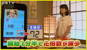 それでは実験スタート!まずは姿勢を正して普段は意識することのない足先まで自分自身に集中します。すると早くも心拍数に変化が!開始1分30秒で通常時より12も下がりました。一川先生によると「まず暗い部屋に入り、外から隔離された環境にいるということで、急激にリラックスしていった」と考えられるそう。その後も、茶会はただただ無言の時間が続きます。実はこれも、リラックスポイント!心拍数がほとんど変動していません。一川先生によると、これは睡眠に入る前の変動に近いそうです。そしてお茶の前にお菓子を頂きます。これには、この後頂く抹茶の味を引きたたせる意味があるそうです。この時、お菓子の話をすることで自然と味覚に意識が集中します。いよいよ、お茶をたてて頂きますがこの抹茶もリラックスポイント。抹茶に最も多く含まれているうまみ成分「テアニン」。神谷先生によるとこのテアニンが脳内に入ると神経伝達物質の濃度に変化が起き、記憶力や集中力のアップに効果があるそうです。さらにカテキン類の抗酸化作用が活性酸素を消去。老化予防の効果もあるといいます。ちなみに抹茶がない場合はお手頃な粉末のお茶でも効果は期待出来るそうです。こうして約20分、自分の五感を意識しながらお茶会は終了。一川先生は「通常の脈拍、心拍数から10以上も下がっており、リラックス出来たと思われる。波形を見ても、変動が少なく落ち着いた心の状態で過ごした」と分析。今回、他の人でも実験しましたが、心拍数の減少が見られました。
