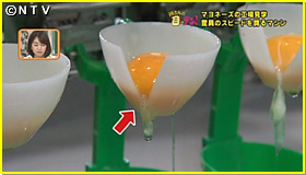 徹底した衛生管理のもと早速、工場内部へ! 実はこの工場のグループでは、日本一タマゴを使っているんです。その数、年間およそ42億個!そう…実はここ、マヨネーズ工場だったんです!この工場では1日80万個の卵を使い20万本ものマヨネーズを生産。見学者に、この工場の一番の魅力を聞いてみると…みなさん、機械のスピードに興味津々の様子。特別に近くで見せて頂くと…そこには、タマゴが高速で運ばれるラインが!さらに、そのラインをよく見ると…なんと!タマゴがものすごい速さで割られていたんです。一体、どうやって割っているのでしょうか?それは、タマゴの下に備えられた「刃」にヒミツがありました。この刃を使って、まずはタマゴに亀裂を作ります。そして、刃を左右に開き、タマゴの中身を受け皿に落とすという仕組みなんです。