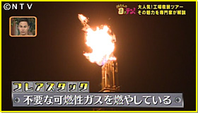 さらに見学を続けると…「フレアスタック」と呼ばれる、不要になった可燃性のガスを燃やしている光景が!そしてここで2つ目の岡田チェック!「工場夜景はアトラクションとして楽しむべし!」岡田先生によると、工場景観というのはすごく動きがなく、静かな所。この"動的な所とのギャップ"が楽しむポイントだと言うんです。さらに!煙突から吹き出す水蒸気も発見!工場夜景はまさに、アトラクションとしても楽しむことができるんです。その後、川崎の工場夜景で一番の見どころである、アンモニアを合成する化学工場が見えてきました。