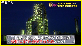 今、工場夜景を見るツアーが大人気!夜の工場に"萌える"ファンが増えていると言うんです。やって来たのは、日本有数の工業地帯・川崎市。工場夜景に詳しい、近畿大学景観工学研究室の岡田昌彰教授に案内して頂きます。午後6時半。屋形船でくつろぎながら出航です。今回参加したクルージングは、京浜工業地帯を2時間かけて回るツアー。さっそく見えたのは、天然ガスの発電所。年間51億キロワットの送電量を誇ると言います。