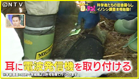 それから体重測定や、蹄のサイズ計測。そして口を開け、歯の状態から年齢を推察。このイノシシは、68kgで4才以上だとわかりました。最後に麻酔を覚ます薬を投与し、動き出したイノシシは森の茂みに消えました。そして8月。イノシシの行動調査を開始します。今回、山本先生の教え子も調査に協力。さっそくイノシシに取り付けた発信機の電波を探すと、いきなり電波をキャッチ!受信する範囲は受信機からおよそ600m。つまり、この先600mの範囲にあのイノシシがいるということ。今度は、少し離れた位置へ移動。再び受信させます。別の場所から受信できれば、その交差するあたりにイノシシがいることがわかるのです。しかしこの調査、一日行っただけでは意味がありません。今後、1年間通じて行えば、ようやく利用できる行動データになるのです。今、その第一歩を歩み始めました!