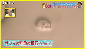 この日も耳石を取り出す作業が行われていました…なんと体長3センチ弱の小さなサンマの稚魚から耳石を取り出していたんです。顕微鏡を見ながら、目の横のあたりを細いピンセットでほじっていきます。頭のサイズはおよそ5ミリしかありません。それにもかかわらず、わずか5分で耳石を発見!耳石のサイズわずか0.3ミリメートル。これが、サンマの稚魚の耳石です。
