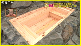 翌日、お月見まであと4日。この日、ユージさんから作業を引き継いだのは、もう一人の実験プレゼンター酒井。この日は、昨日、風呂の周りに並べた大岩の隙間にユージが運んだ石を詰めて、セメントで固めていく作業。セメントを使うのは初めてという酒井は最初はおぼつかない手つきでしたが、3時間も経つと大分手馴れてきました。そして、ユージと酒井が協力して作り上げた露天風呂が完成!浴槽は、ぜいたくにひのき張り!岩積みも風情ある仕上がり!お風呂の奥には、酒井さんが作った脱衣所。下にすのこを敷き、すだれで目隠しをするという酒井さんらしい工夫が。お風呂に入った人が、田畑を一望できる立地も抜群です!