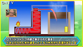 根本先生はこのロケットストーブをお風呂のお湯が沸かせるように改良してくれました。ポイントは、中に差し込んである、グルグルに巻いた銅で作られた管。管の片方にポンプを取り付けお風呂に張った水を循環させます。ロケットストーブ内部で熱せられた管の中をお風呂の水が通ることで温められ、お湯になって出てくるという仕組みなのです。これは、ガス湯沸かし器や昔の薪で沸かすようなお風呂と基本的には原理は一緒。ただ、ロケットストーブと組み合わせて携帯型なのでアウトドアのところに持ち運べるのです、その名もロケットボイラー。そして、このロケットボイラーにはさらにすごいポイントが!お湯を回すポンプは発電鍋を使うのです。鍋には熱電変換素子という熱が加わると電気に変換するという素子が入っており、これをロケットボイラーの上に乗せ発電した電気でこのポンプを回すのです。つまりこれは、電気もガスも使わず、さらに簡単に持ち運びも可能な温水器なのです!