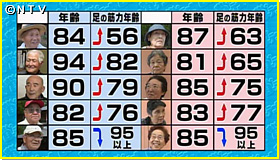 計測法は、座った状態で片足にベルトをひっかけます。ベルトの先には筋力計を設置、足を前に出す力を計測。その値を年齢別の平均値グラフに当てはめ、足の筋力年齢を導き出します。まずは、元駅長さん曽根原武信さん94歳。