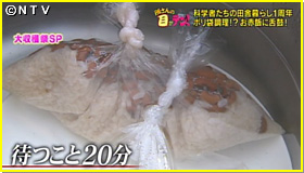 3.あと袋の口をクルクルまいてお湯に漬けるだけ。この時、鍋が100℃以上になるので下に皿を敷き、なべ底にポリ袋が付かないようにする。これで20分待てば完成。