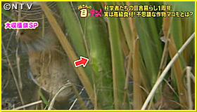 まず、所さんたちとマコモを収穫します。茎のコブになっているところが食べれる部分。黒穂菌という微生物に感染して10月頃になるとどういうわけか、その部分が太ってきます。感染しないと太くならないのでただの雑草。菌の働きでマコモはできるんです。この部分はタケノコみたいなので「マコモダケ」と呼びます。採れたてのマコモを持って立松先生のところへ。