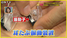 そして最後に、ちょっと意外な分野からもお知恵を拝借。感情に働きかける情報技術について研究している、東京大学情報理工学系研究科の福嶋政期先生は「人の驚きを増幅させることができる」と分析。と…先生が取り出したのは、謎の装置。それを、両耳にクリップで挟んで装着。実はこれ、「耳たぶ振動装置」。クリップの裏に振動子がついているんです。でも、これで驚きが増幅するとはどういうことなのか?