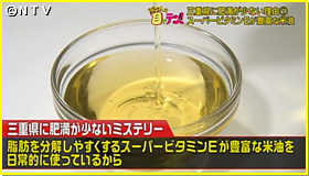 先生たちと桑名市内にあるスーパーマーケットで調査開始。すると医学の専門家、井上先生が「米油」に注目。米油とは、玄米を精米する際に出る米ぬかが原料。米ぬかには、およそ20%の油分が含まれており、この油分を取り出してできるのが「米油」なんです。井上先生によると、米油の中にはスーパービタミンEと呼ばれる肥満を改善する様な成分が含まれています。