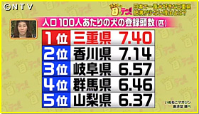 続いて、伊勢神宮で肥満が少ない謎を調査。伊勢神宮へ続く参道は800メートルほどあり、伊勢名物の太くて柔らかい麺を真っ黒で濃厚なつゆで食べる伊勢うどんの店があったり、餅をこしあんで包んだ三重名物赤福餅の店もあり観光客に大人気のスポット。そして参道を歩いていると至る所に犬のグッズが。歴史に詳しい千種先生によると、この犬こそが三重県に肥満が少ないミステリーを解く鍵とのこと。実は三重県は100人中7.4人の人が犬を飼っており日本一の犬好き県なんです!