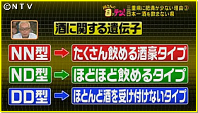 一体ナゼなのか?そこには驚くべき事実がありました!医学の井上先生によると、三重県の方は全国で一番、遺伝子的にお酒に弱いという事が分かっています。お酒に弱い遺伝子は3つの型があり、NN型、ND型、DD型。NN型はたくさん飲める酒豪タイプ。ND型はほどほど飲めるタイプ。DD型はほとんどお酒を受け付けないタイプ。そして三重県はお酒を受け付けないDD型の遺伝子の人が13.7%いて、全国で一番多いのです。ちなみに、全国で最もお酒に強いのはDD型の人が1.5%しかいない秋田県。