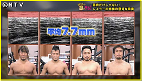 さらに、その筋肉の詳細を調べるため、超音波による画像計測装置で選手の筋肉の厚みを調べると、棚橋選手の大胸筋の厚みは29.6ミリ。ちなみに渡辺裕太の大胸筋の厚みは8.8ミリ。一般人の3倍の筋肉の厚みだったんです。レスラー4人の平均は32.8ミリでした。