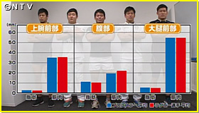 ならば!ラグビー選手はレスラーと同じ体の特徴なのか?検証です!レスラーと同じ大胸筋を超音波で計測してみると…確かに、脂肪と筋肉の厚みにレスラーと同じような特徴がありました。さらに、腕や腹部、太ももの厚みも計測してみると…なんと、すべての部位においてレスラーと同じような筋肉と脂肪のバランスでした。