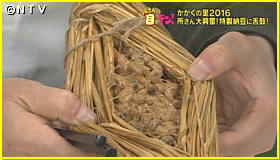 まず、保存してあった稲わらをヒモで結わい"藁つと"と呼ばれる納豆の入れ物を作ります。藁には納豆菌が付いています。"藁つと"に入れられた大豆は納豆菌の働きで発酵し、納豆になるのです。すると松村先生、出来上がった藁つとを沸騰したお湯の中へ。実は納豆菌の胞子以外の雑菌は、100℃のお湯で煮沸することで、ほとんどが死滅。つまり、この藁つとには現在、納豆菌の胞子だけが付いているということになるのです。この中に、一晩水に漬けてから蒸かした大豆を入れます。これを、納豆菌が最も活性化する40℃程度で保温しておけば、2〜3日程度で納豆になるのです。