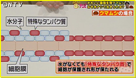 一方、クマムシの細胞膜には、水の分子の他に、似たようなものが細胞膜を覆っています。これが、クマムシの特殊なタンパク質。このタンパク質は水の分子と同じ働きをするので、もし水が無くなっても細胞膜の形を保つことができ、バラバラにならないんです。なので、水を再び投入すれば、生命活動も復活するんです。
