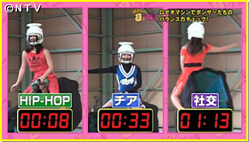 その後…チアリーダーと社交ダンサーは順調にタイムを伸ばしていきますが…30秒を過ぎたところで、チアリーダーが脱落。結果は33秒。ただ1人残った社交ダンサーは姿勢もブレることなく、ぐんぐんとタイムを伸ばしていき…結果、1分13秒とダントツの記録!それでは、いよいよポールダンサーの番です。果たして、社交ダンサーの大記録を越えることができるのか!?まずは安定した滑り出し。17秒を過ぎた辺りから、少しバランスを崩し立て続けにピンポン球を落としてしまいますしかしその後は持ち直し、またも安定した乗りこなし。社交ダンサーの記録に向け、1分の大台が見えてきた、その時!最後の1個を守りきれず、57秒、という結果に終わりました。