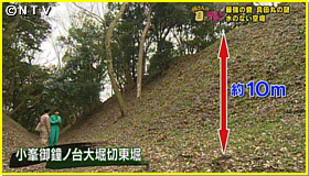 小田原市役所の土屋さんに、案内していただきます。戦国時代から現存する空堀としては、日本最大級という貴重なこちらの空堀は高さ、およそ10m。真田丸の空堀と、ほぼ同じ大きさです。傾斜を測ってみると、傾斜は50度以上!雪山を滑るスキーのアルペン競技より急な、超急斜面!当時は、この急な空掘の上に、柵などを築き、守る側の兵は下から登ってくる敵を撃退したといいます。でも、本当に堀を突破することはできないのでしょうか?