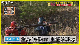 さらに!当時の戦いの様子を描いた「大坂冬の陣図屏風」には、恐るべき真田軍のスーパー兵器が描かれていました。徳川軍に鉄砲で攻撃する兵士の中に、3人がかりで撃つ兵士の姿がこの兵士たちが使っていたのは、「狭間筒」という城を守るときに使う鉄砲。澤田さんによると、20発の弾を同時に撃てる散弾(さんだん)銃(じゅう)のようなもので、一度に5、6人の兵を倒したといいます。全長165cm、重さ30kgもある巨大な銃で、バズーカのように前半分を支えて撃ちます。今回特別に、空砲で撃ってもらうと、とんでもない破壊力があったことが想像できます。