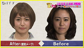 森川先生によると、この錯視をメークに応用するためには、ノーズシャドウを用いるそうです。ノーズシャドウとは、通常、鼻筋にそって入れる、影を作るメーク。ノーズシャドーで鼻を強調させ、鼻で顔の幅を分割するんです。二分割することで、顔の幅が狭く見えるんです。錯覚メークでは、目頭の脇にちょっとだけシャドーを描くことで鼻筋が強調され、顔を分割することができました。さまざまな錯覚技を利用したメークで磯山さんは小顔に変身することができました!
