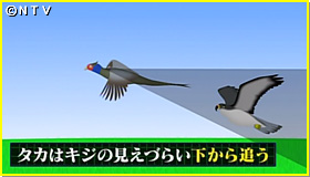 例えば、映像にはタカが地面すれすれを飛ぶ様子が映っていました。実はキジは頭上を警戒する習性があり、上から追いかける敵に対しては非常に敏感。そこでタカは、低空飛行でキジに見えないところから追いかけていたんです。