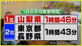 実は、家族での食事時間に、重要な健康長寿の秘訣が!下方先生によると、「話ながら笑いながら、みんなで食べるとゆっくり自然に食べますよね。時間をかけて食べることによって、よく噛むとそれが口の周りの血流を増やして脳の血流を増やして、最終的には認知症を予防することにも繋がります。しかも、ゆっくり食べると血糖値の上がりを抑えることができる」と解説。実は山梨県は1日の平均食事時間が1時間46分と、これまた日本一。