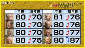 試しに、実年齢27歳の渡辺裕太さんがやってみると…実年齢より1歳上の28歳になってしまいました。では、無尽に参加するご長寿さんたちはいかがでしょう?まずは、80歳の齋藤さんが挑戦です!結果は…実年齢よりも4歳若い76歳。続いては、浅利さん80歳が挑戦!結果は…なんと!実年齢より脳年齢が10歳も若かったんです。無尽をやっているご長寿8人の脳年齢を調べたところ、7人が実年齢より若かったのです。どうやら、山梨に今も根付いている助け合い文化、無尽が、健康長寿につながっているようです。
