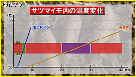 まずは落ちていた小石を洗い鍋に敷き詰めます。ロケットストーブで20分ほど石を熱したら、サツマイモを入れ、フタを閉め、あとは1時間、焼きます。この間も、ロケットストーブは炊きっぱなしです。実は、石の熱で時間をかけてじっくり焼くことで、美味しくなる科学的な理由が。焼き芋の甘さは、デンプンが酵素の働きで麦芽糖に変わるからなのですが。その酵素が最も活発に働く温度帯が65℃〜75℃。例えば、電子レンジでサツマイモを加熱すると、およそ6分程度で食べられますが、酵素がよく働く温度帯を通過する時間も短くなるためじっくり焼く石焼に比べ、甘さが減るのです。そして1時間後石焼き芋が完成!黄色くネットリとした食感が特徴のベニマサリは石焼き芋にぴったりの品種なんです。